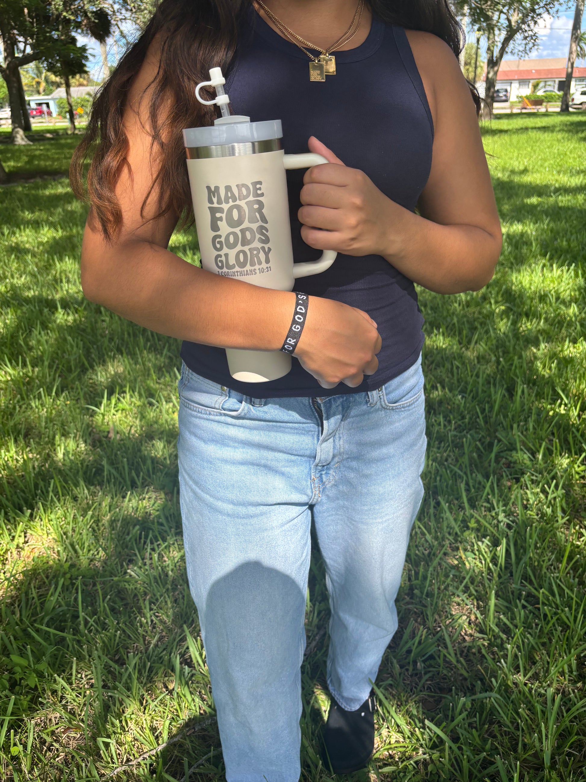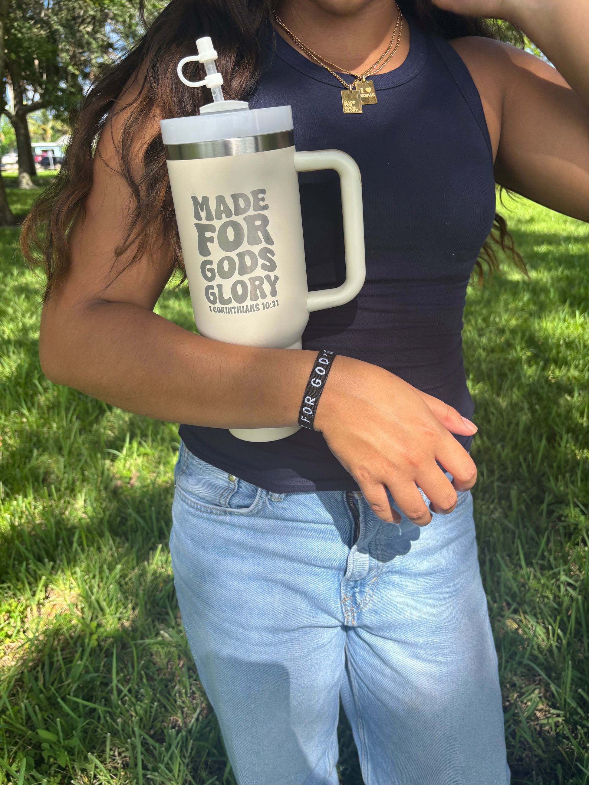 This is a black jacquard bracelet with white woven text reading “Made for God’s Glory.”